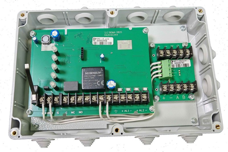 КА2 исп.08 подключается к БЦП по интерфейсу RS-485, содержит дополнительно один релейный выход с контактами на переключение. КА2 исп.08 выпускается в двух вариантах исполнения: КА2 исп.08 (степень защищенности от воздействия окружающей среды IP 20) и КА2 исп.08П (степень защищенности от воздействия окружающей среды IP 54).